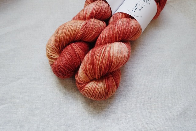 このモヘア混の糸を染めようと思ったとき。 真っ先に思い浮かんだのがこの色でした。 草木染めで使う茜のような、ほんのりオレンジがかった色は暗くなりがちな冬の装いによく映えて、しかも派手すぎない色です。 私も早速靴下を編んでみました。 なんだか足元がポカポカしてくるような気持ちに! -------------------------------- Premium Mohair Sock 100g/425m fingering 65% Superwash Merino (21 mic), 20% Recycled Nylon, 15% Kid Mohair -------------------------------- <注意事項> ・全て手染めで仕上げており、かせごとに微妙に色の入り方が違います。 世界に1つだけの色合いですので、気に入ったらぜひお早めにお買い求めください。 ・玉巻は対応していません。 ■ 発送・注文に関する情報や注意事項 - 通常、注文から発送まで3営業日を予定しています。