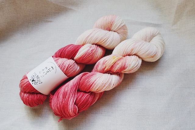 忍ぶれど 色に出でにけり わが恋は ものや思ふと 人の問ふまで という、平兼盛の和歌のように、毛糸好きは好きな色を見るとニヤニヤ顔を隠しきれません。 なぜかこの色を染めたとき、この歌が頭に思い浮かびました。 贅沢に、シルクの入った糸なので編み地はしっとりとしていて少し光沢があります。 ウール100%の糸よりも艶やかで、ナイロン混とは思えない編みやすさ。 肌触りも柔らかなので、靴下はもちろんショールや直接肌に触れるウェアにもお使いいただけます。 ちなみに… シルクはウールと同じく保温性がある素材です。 通気性もよくて、コットンより吸湿性があるとも言われています。 そんなシルクを編みものに。 シルク糸100%にありがちな糸割れもしにくいので、ストレスなく編み進められます。 編む時間を楽しく、そして心躍るようなひとときに。 1かせで靴下が1足編めるボリュームです。 -------------------------------- Premium Silk + Wool Sock 100g/425m fingering 60% superwash Merino,20% Nylon,20% Silk -------------------------------- <注意事項> ・全て手染めで仕上げており、かせごとに微妙に色の入り方が違います。 世界に1つだけの色合いですので、気に入ったらぜひお早めにお買い求めください。 ・玉巻は対応していません。 ■ 発送・注文に関する情報や注意事項 - 通常、注文から発送まで3営業日を予定しています。