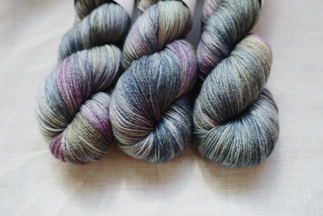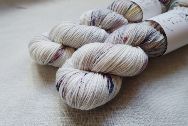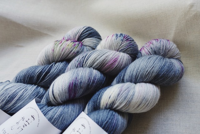 以前染めたヴィンテージデニムを、シルクの糸でも染めました。 ウールとシルクが配合されているので、手触りはしっとり。 デニムというよりも編み地の質感はテンセル調になりそうですが それでもどこかヴィンテージ感漂うこの雰囲気には個人的にもうっとり。 贅沢に、シルクの入った糸なので編み地はしっとりとしていて少し光沢があります。 ウール100%の糸よりも艶やかで、ナイロン混とは思えない編みやすさ。 肌触りも柔らかなので、靴下はもちろんショールや直接肌に触れるウェアにもお使いいただけます。 ちなみに… シルクはウールと同じく保温性がある素材です。 通気性もよくて、コットンより吸湿性があるとも言われています。 そんなシルクを編みものに。 シルク糸100%にありがちな糸割れもしにくいので、ストレスなく編み進められます。 編む時間を楽しく、そして心躍るようなひとときに。 1かせで靴下が1足編めるボリュームです。 -------------------------------- Premium Silk + Wool Sock 100g/425m fingering 60% superwash Merino,20% Nylon,20% Silk -------------------------------- <注意事項> ・全て手染めで仕上げており、かせごとに微妙に色の入り方が違います。 世界に1つだけの色合いですので、気に入ったらぜひお早めにお買い求めください。 ・玉巻は対応していません。 ■ 発送・注文に関する情報や注意事項 - 通常、注文から発送まで3営業日を予定しています。
