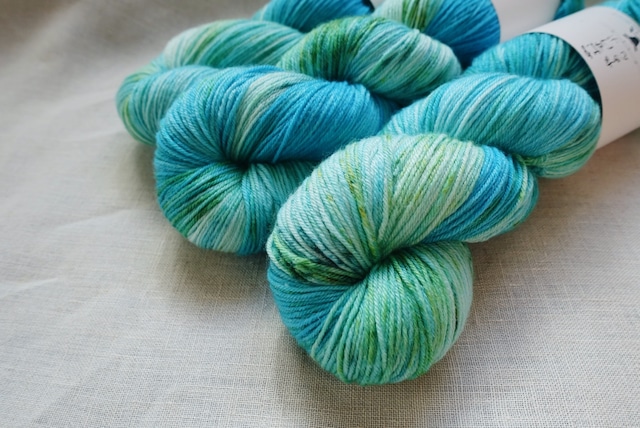 寒い冬はコタツに入ってアイス。なんて言いますが、もし私が食べるならバニラアイスよりもソーダ味。 乾いた喉を潤してくれる甘いあの味をイメージしました。 贅沢に、シルクの入った糸なので編み地はしっとりとしていて少し光沢があります。 ウール100%の糸よりも艶やかで、ナイロン混とは思えない編みやすさ。 肌触りも柔らかなので、靴下はもちろんショールや直接肌に触れるウェアにもお使いいただけます。 ちなみに… シルクはウールと同じく保温性がある素材です。 通気性もよくて、コットンより吸湿性があるとも言われています。 そんなシルクを編みものに。 シルク糸100%にありがちな糸割れもしにくいので、ストレスなく編み進められます。 編む時間を楽しく、そして心躍るようなひとときに。 1かせで靴下が1足編めるボリュームです。 -------------------------------- Premium Silk + Wool Sock 100g/425m fingering 60% superwash Merino,20% Nylon,20% Silk -------------------------------- <注意事項> ・全て手染めで仕上げており、かせごとに微妙に色の入り方が違います。 世界に1つだけの色合いですので、気に入ったらぜひお早めにお買い求めください。 ・玉巻は対応していません。 ■ 発送・注文に関する情報や注意事項 - 通常、注文から発送まで3営業日を予定しています。