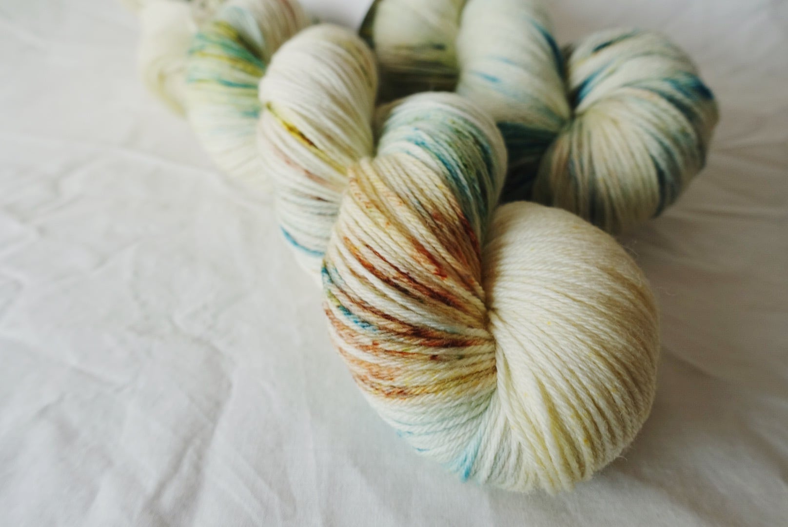 次々現れるグリーンやブラウンのスペックルも楽しい手染め毛糸です。