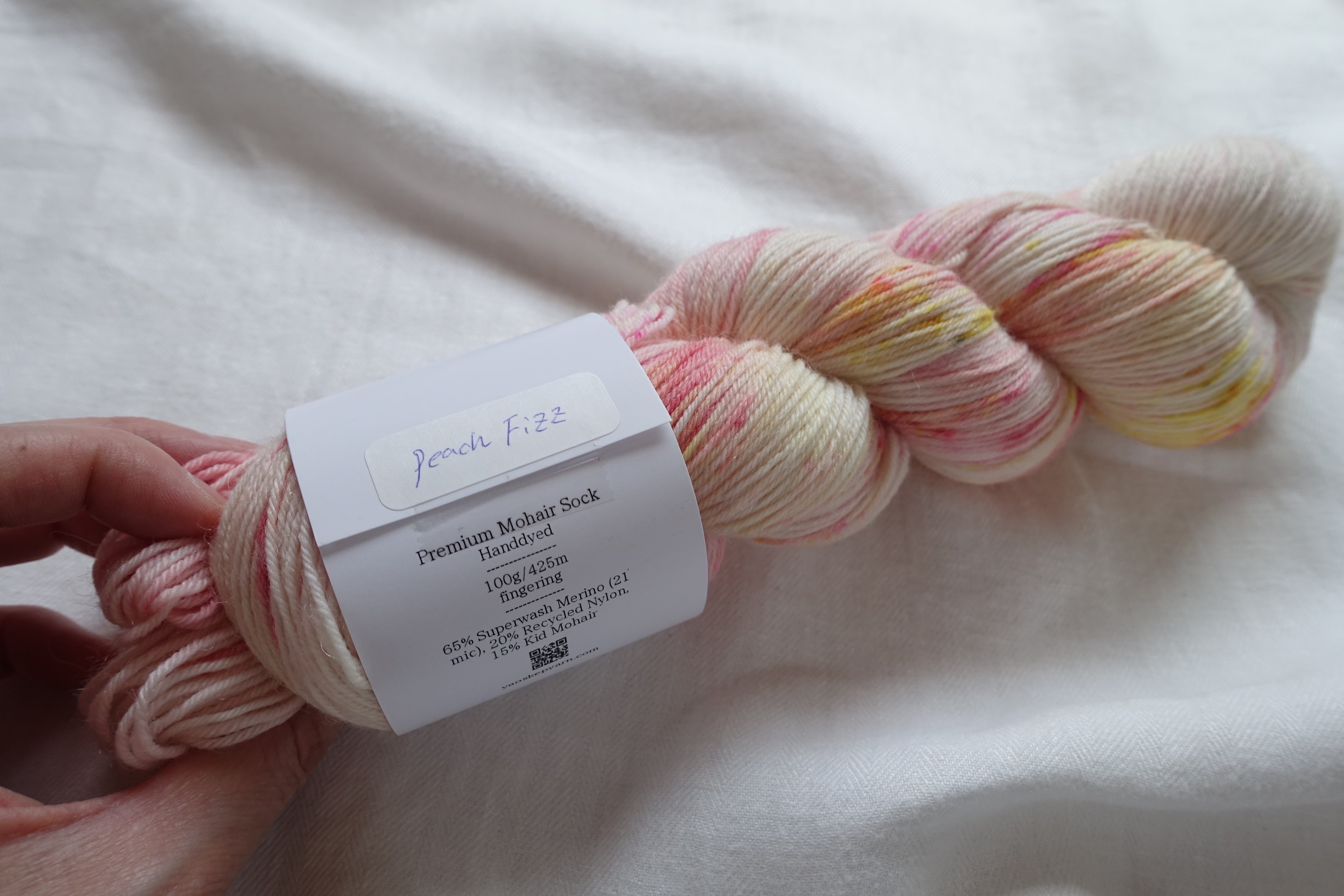 1かせで靴下を編める100g425mのモヘア混の糸。