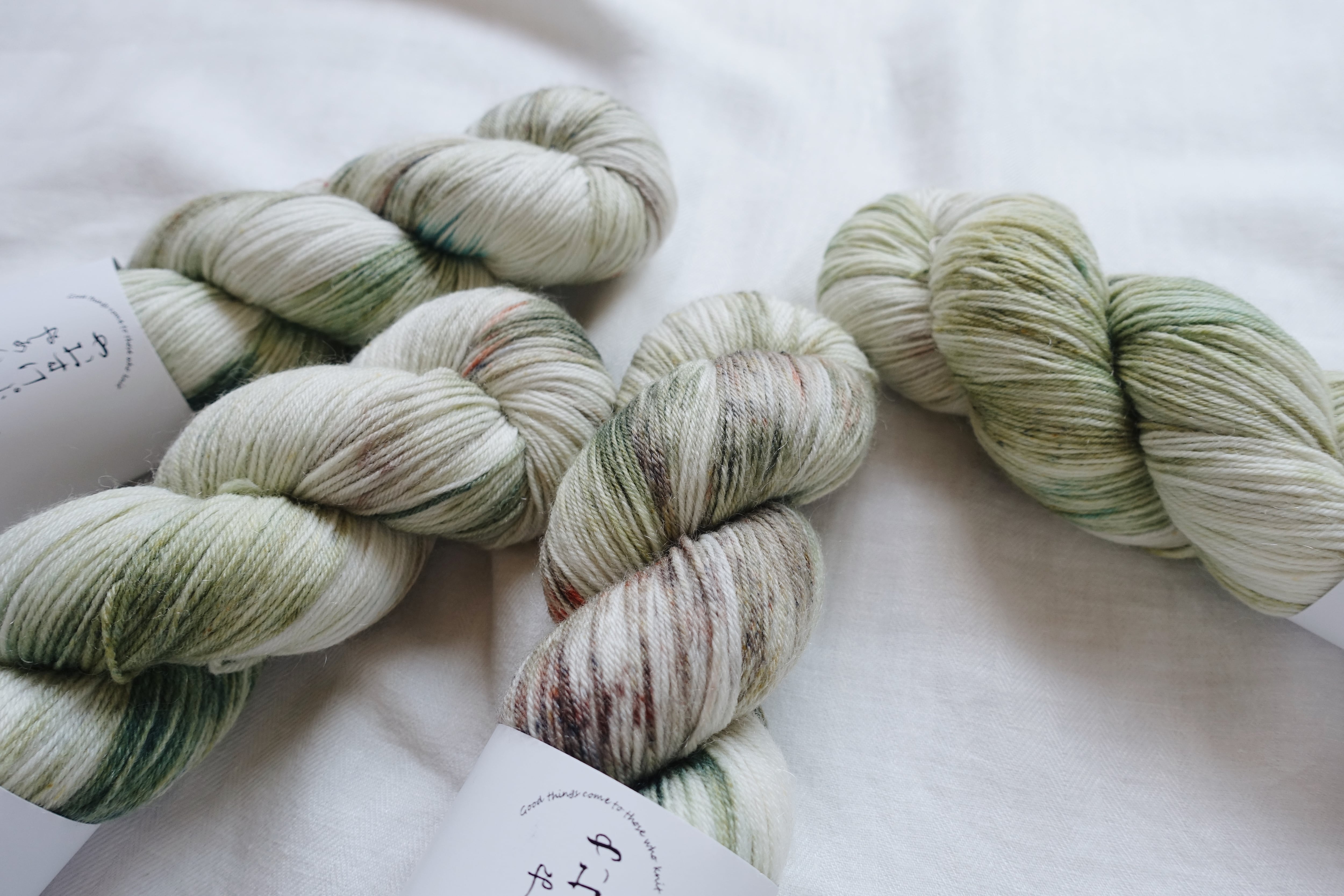 うっすら入ったグリーンが春の軽やかさを感じさせる手染毛糸です。